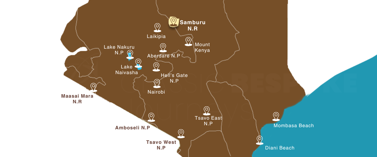 Samburu National Reserve is located in Northern Kenya, along the Ewaso Ng’iro River. It covers about 165 square kilometres and borders Buffalo Springs and Shaba National Reserves. It’s well-known for the “Samburu Special Five” animals, which include the Grevy’s zebra, Somali ostrich, reticulated giraffe, gerenuk, and Beisa oryx.